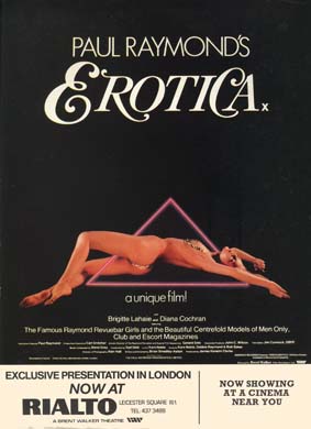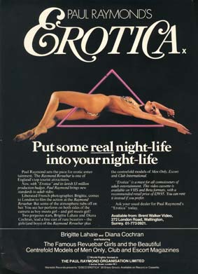 In 1981, he combined all his interests in an extraordinary vanity project, the grandly-titled Paul Raymond’s Erotica, in which French porn queen Brigitte Lahaie played a journalist examining the sexy world of the Revuebar and Raymond’s glamorous lifestyle. Directed by Brian Smedley-Aston and designed to be several cuts about the usual British sex film of the era (a genre that was already on its last legs), Erotica instead is a mix of egomania, extraordinarily down-market softcore (one sex scene takes place in a refrigerated meat truck) and footage of the Revuebar, in which bored punters – in reality, Paul Raymond Publications staffers – watch dead-eyed men and women simulating sex amongst extravagant sets, in scenes that have all the erotic appeal of a trip to the morgue.