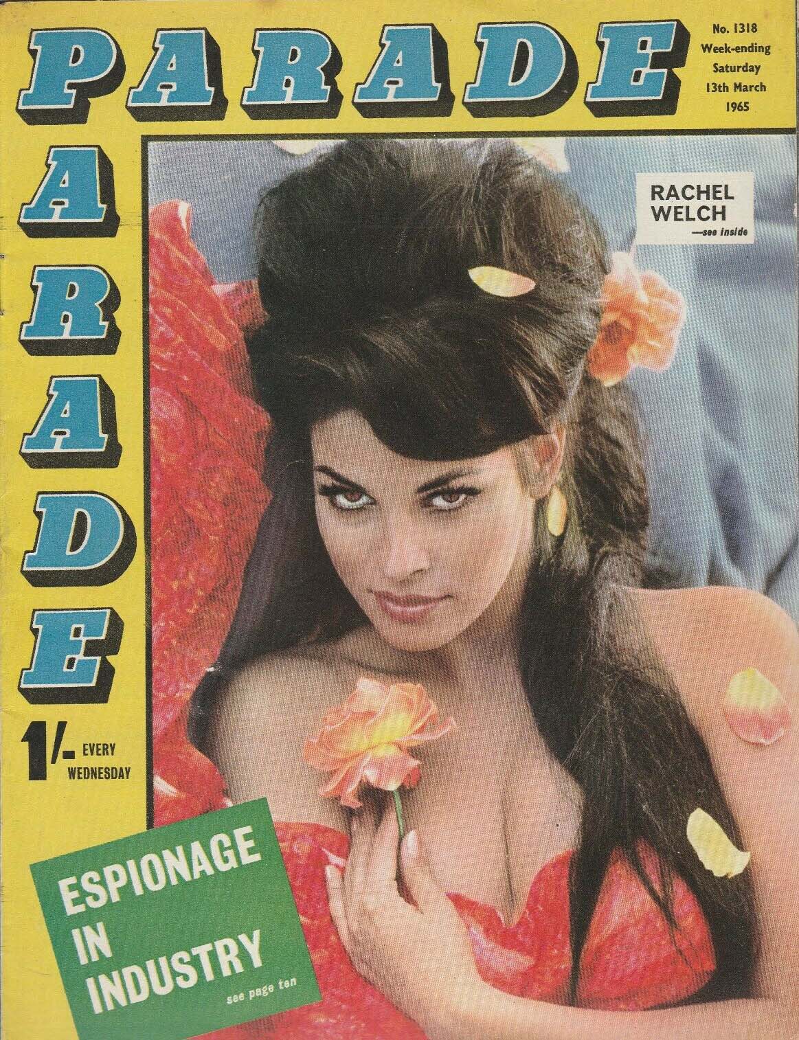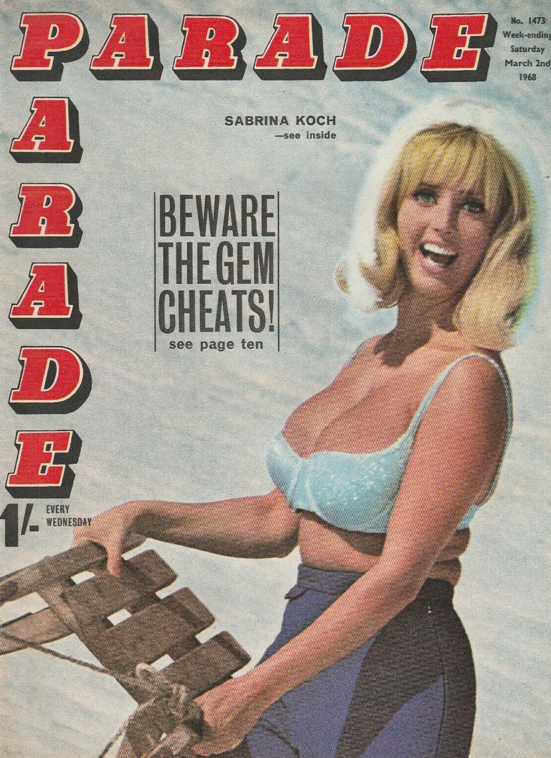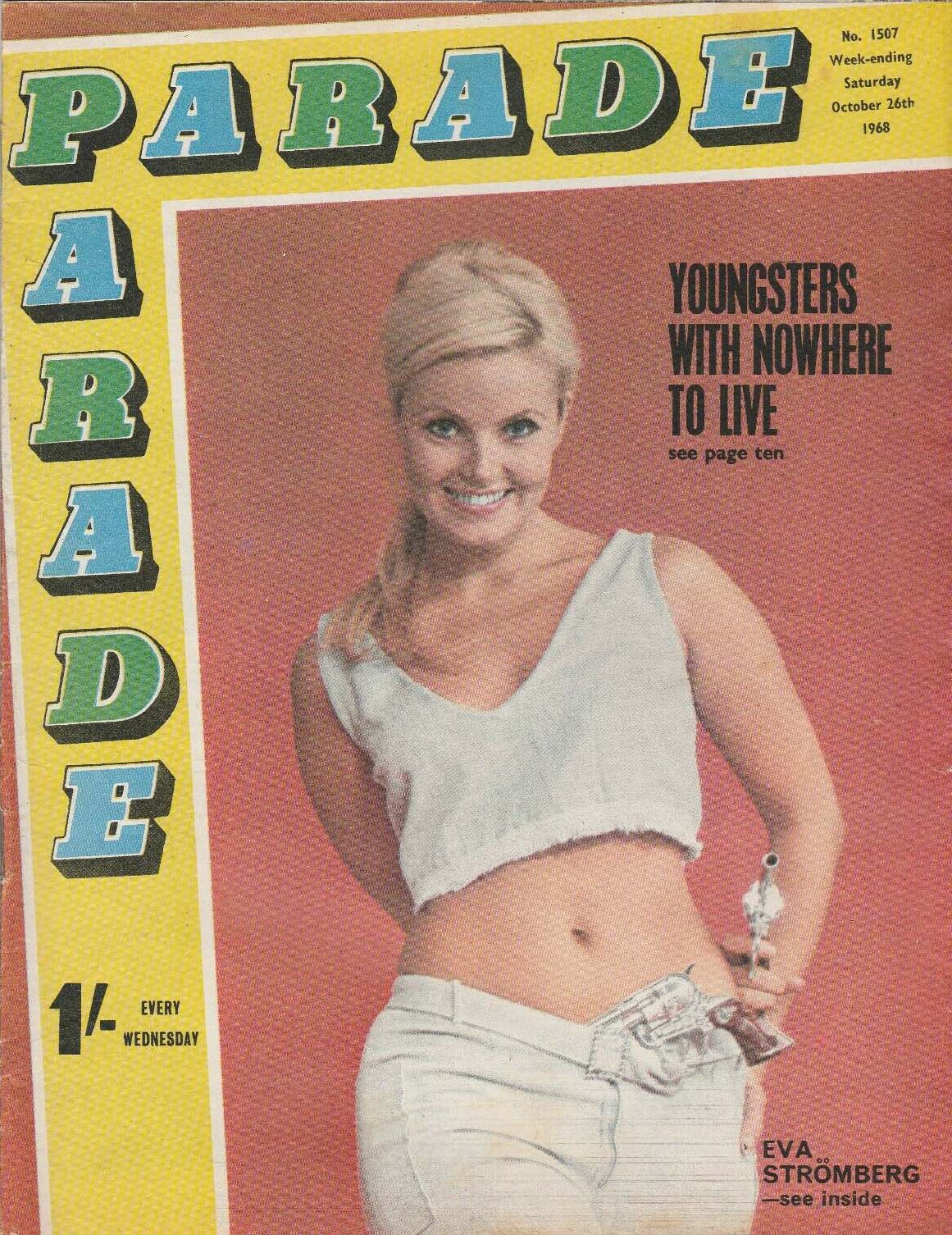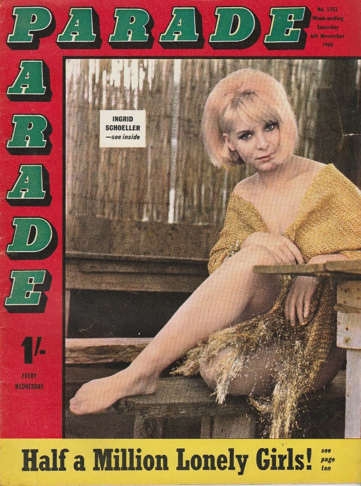 Connoisseurs might argue the point, but for us, the glory days of Parade were the 1960s. The combination of sexy starlets and scandal – often moralising stories and campaigning outrage – was a fascinating one, but it is the covers that really stand out as a genuine parade of 1960s glamour. If you want to see how sex symbols, movie starlets and international top totty – not to mention public tastes and moral attitudes – evolved during the decade, this is as good a place to start as any, as film stills featuring big names like Sophia Loren and Gina Lollobrigida give way to bikini shots of continental models and, eventually, near-topless cheesecake images. Along the way, the international starlets with exotic names mix with big-name movie stars like Raquel Welch (whose name is misspelt at one point as Rachel), Charlotte Rampling, Ann-Margret and Ursula Andress; cult Euro movie stars like Silvia Koschina, Marissa Mell, Pamela Tiffin, Janet Agren, Margaret Lee and Claudia Cardinale; Hammer glamour girls Veronica Carlson, Yutte Stensgaard and Yvonne Romain; and legendary British nude models Margaret Nolan (still in her Vicky Kennedy persona), Annette Johnson and June Palmer – all featured on a virtually unchanging design throughout the decade. It’s a fascinating archive – and our gallery here only scratches the surface of a decade that saw over 600 editions published.