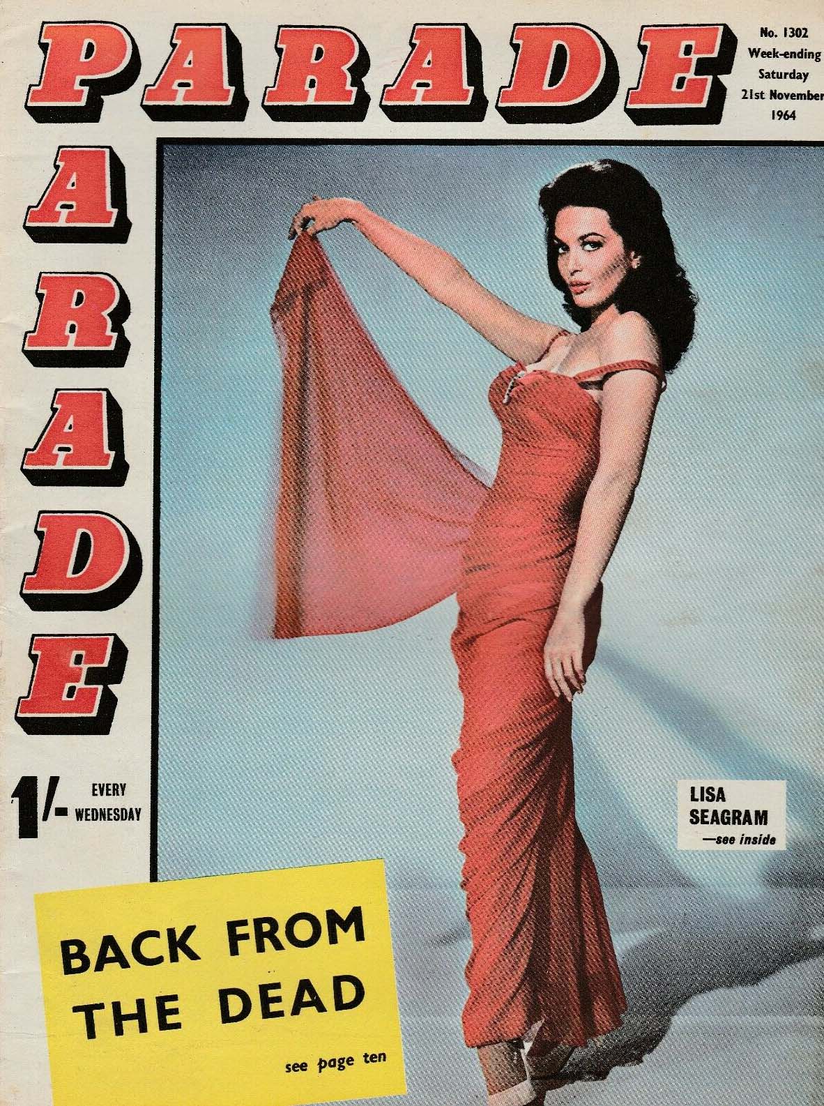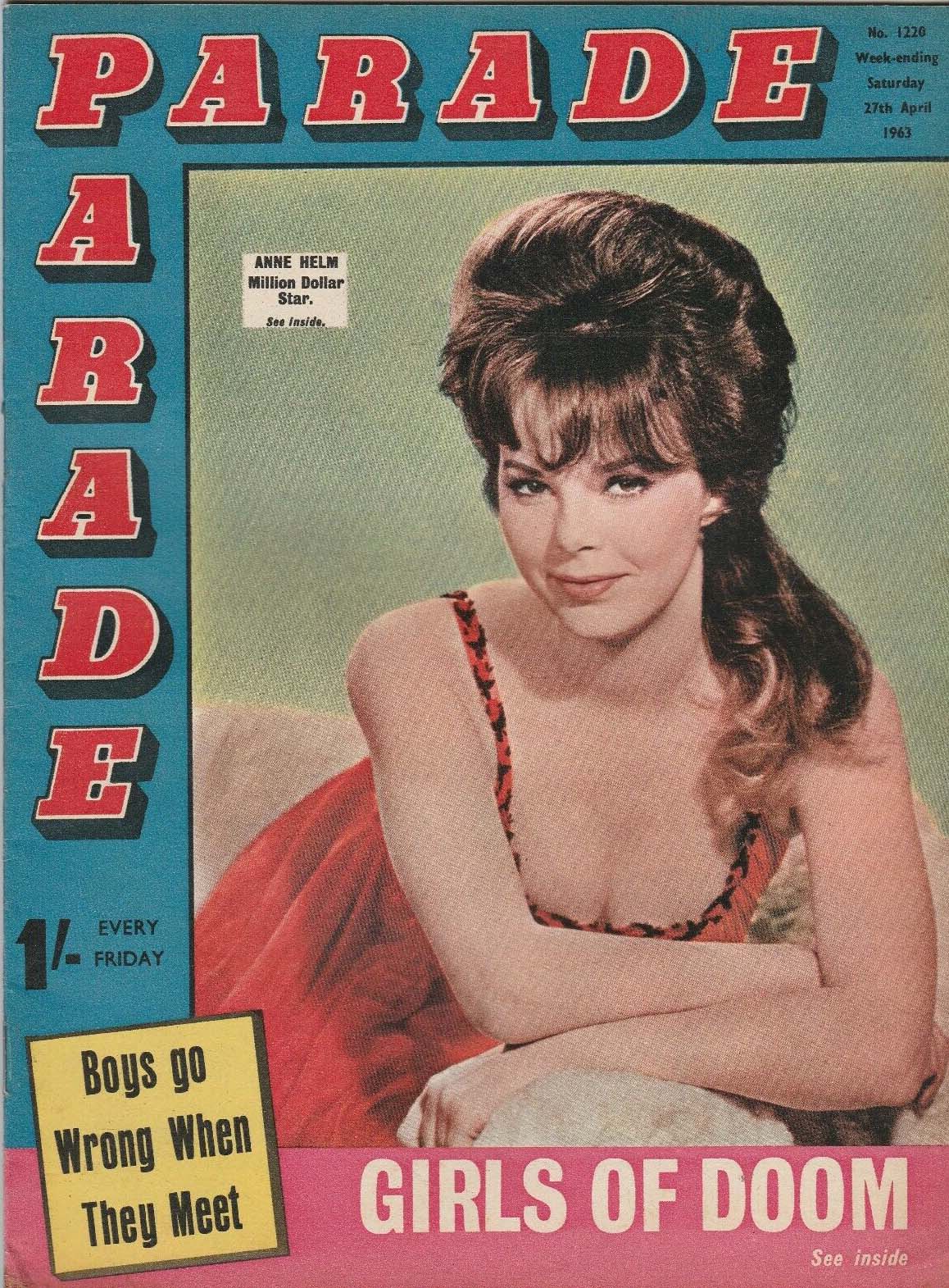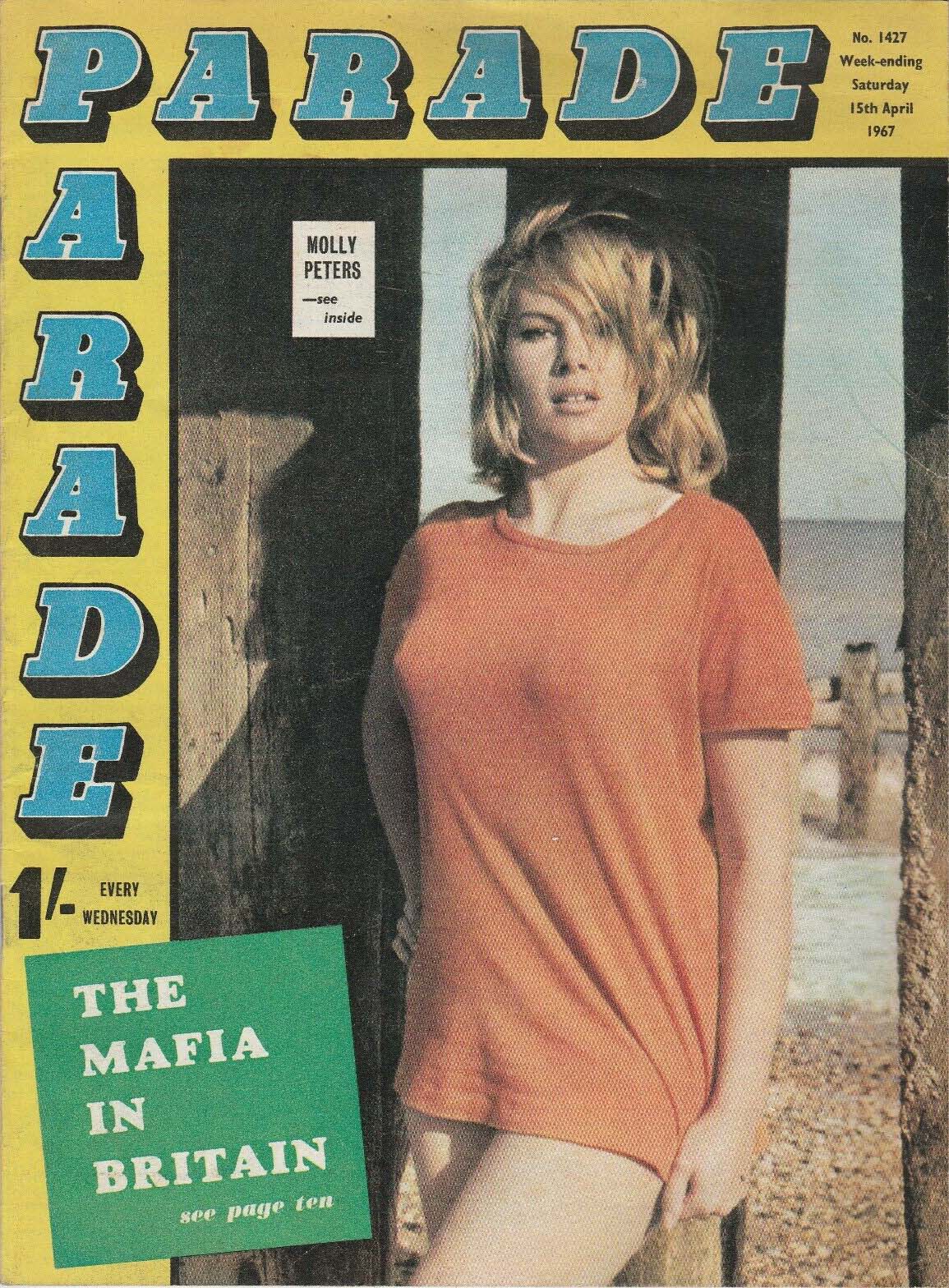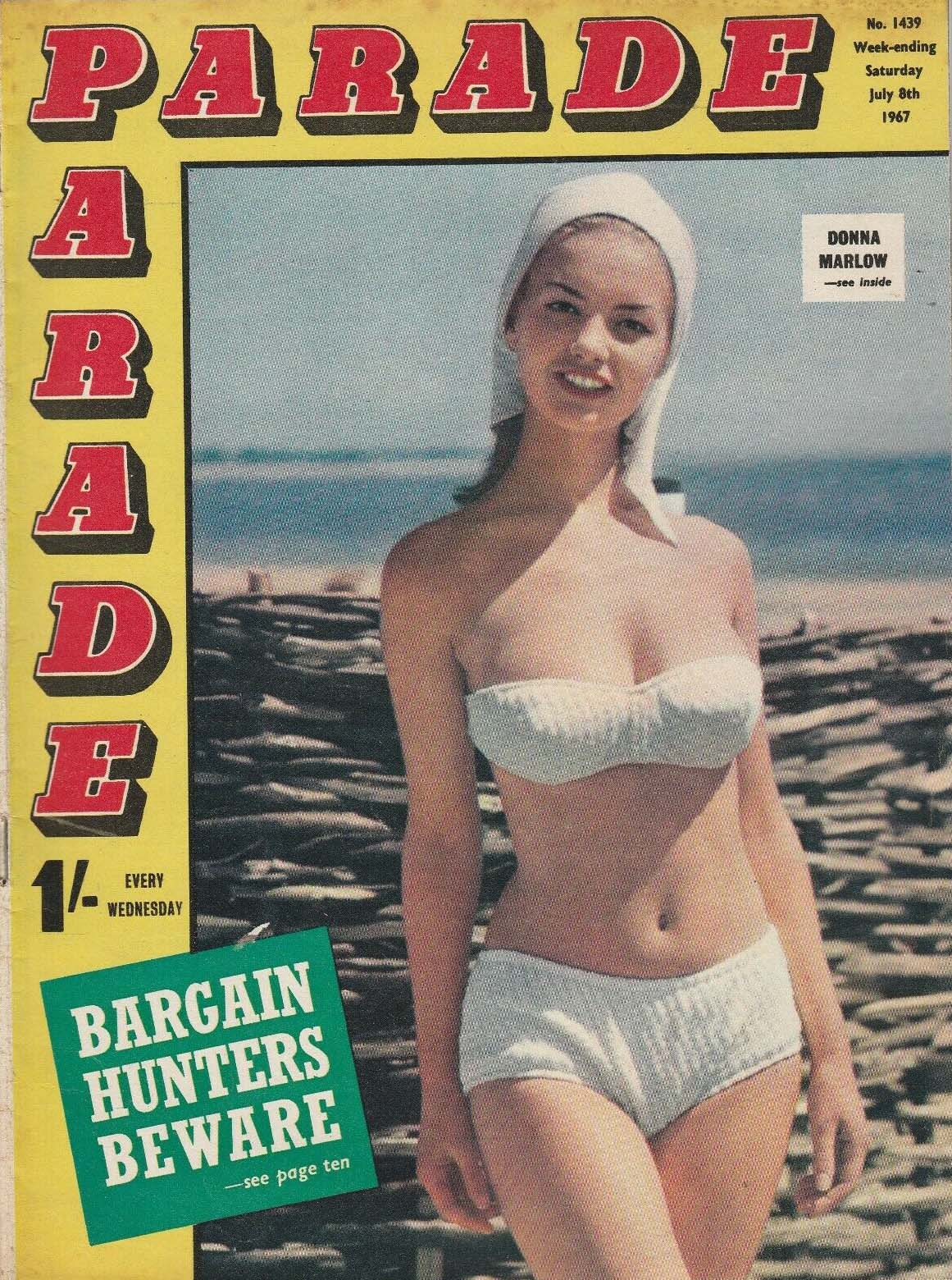 Connoisseurs might argue the point, but for us, the glory days of Parade were the 1960s. The combination of sexy starlets and scandal – often moralising stories and campaigning outrage – was a fascinating one, but it is the covers that really stand out as a genuine parade of 1960s glamour. If you want to see how sex symbols, movie starlets and international top totty – not to mention public tastes and moral attitudes – evolved during the decade, this is as good a place to start as any, as film stills featuring big names like Sophia Loren and Gina Lollobrigida give way to bikini shots of continental models and, eventually, near-topless cheesecake images. Along the way, the international starlets with exotic names mix with big-name movie stars like Raquel Welch (whose name is misspelt at one point as Rachel), Charlotte Rampling, Ann-Margret and Ursula Andress; cult Euro movie stars like Silvia Koschina, Marissa Mell, Pamela Tiffin, Janet Agren, Margaret Lee and Claudia Cardinale; Hammer glamour girls Veronica Carlson, Yutte Stensgaard and Yvonne Romain; and legendary British nude models Margaret Nolan (still in her Vicky Kennedy persona), Annette Johnson and June Palmer – all featured on a virtually unchanging design throughout the decade. It’s a fascinating archive – and our gallery here only scratches the surface of a decade that saw over 600 editions published.