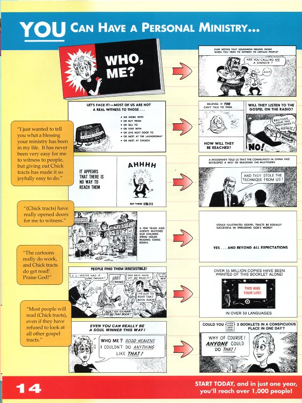 Also included was the current Chick catalogue, listing all his publications – not just the glorious collection of tracts, but full-size comic books and paperbacks exposing the dangers of rock music, Masonry and evolution. It is, as you might expect, a wild ride that includes testimonials by clearly damaged people and a touching story of how Chick browbeat a work colleague away from Mormonism and back onto the path of righteousness.