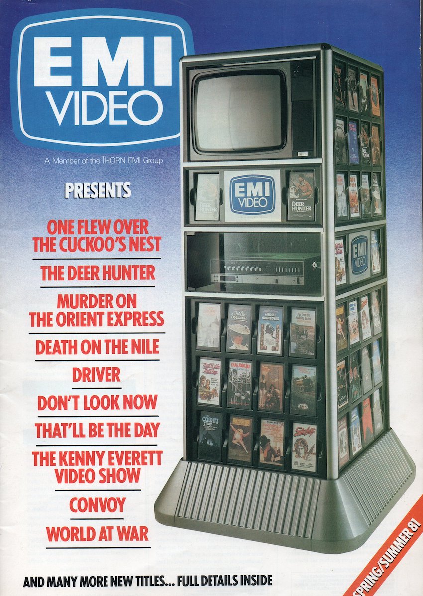 Continuing our occasional resurrection of old British pre-cert video catalogues, here are a pair from EMI, once a major name in the UK entertainment industry. Already well-established as a record label – one of ‘the big four’ in the British music industry, they were home to the Beatles, Pink Floyd, Iron Maiden, Kate Bush and countless others – EMI also had its fingers in film production and distribution, and so an early move to home video was inevitable.